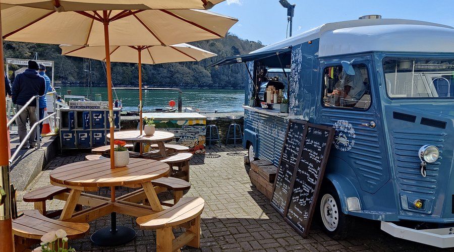 Humble food truck along River Fowey offering seafood, sweets & coffee, plus umbrella-shaded tables.